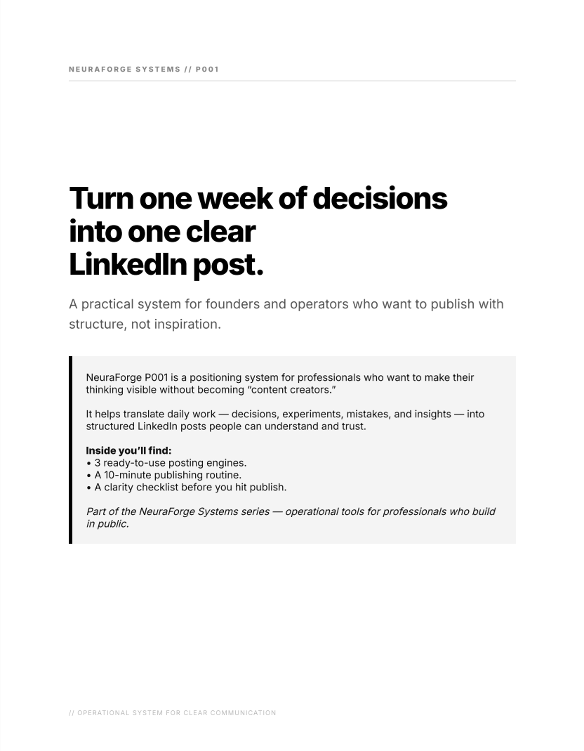 NeuraForge P001 is a practical positioning system for founders, consultants, and operators who want to communicate their work on LinkedIn with clarity, not hype.